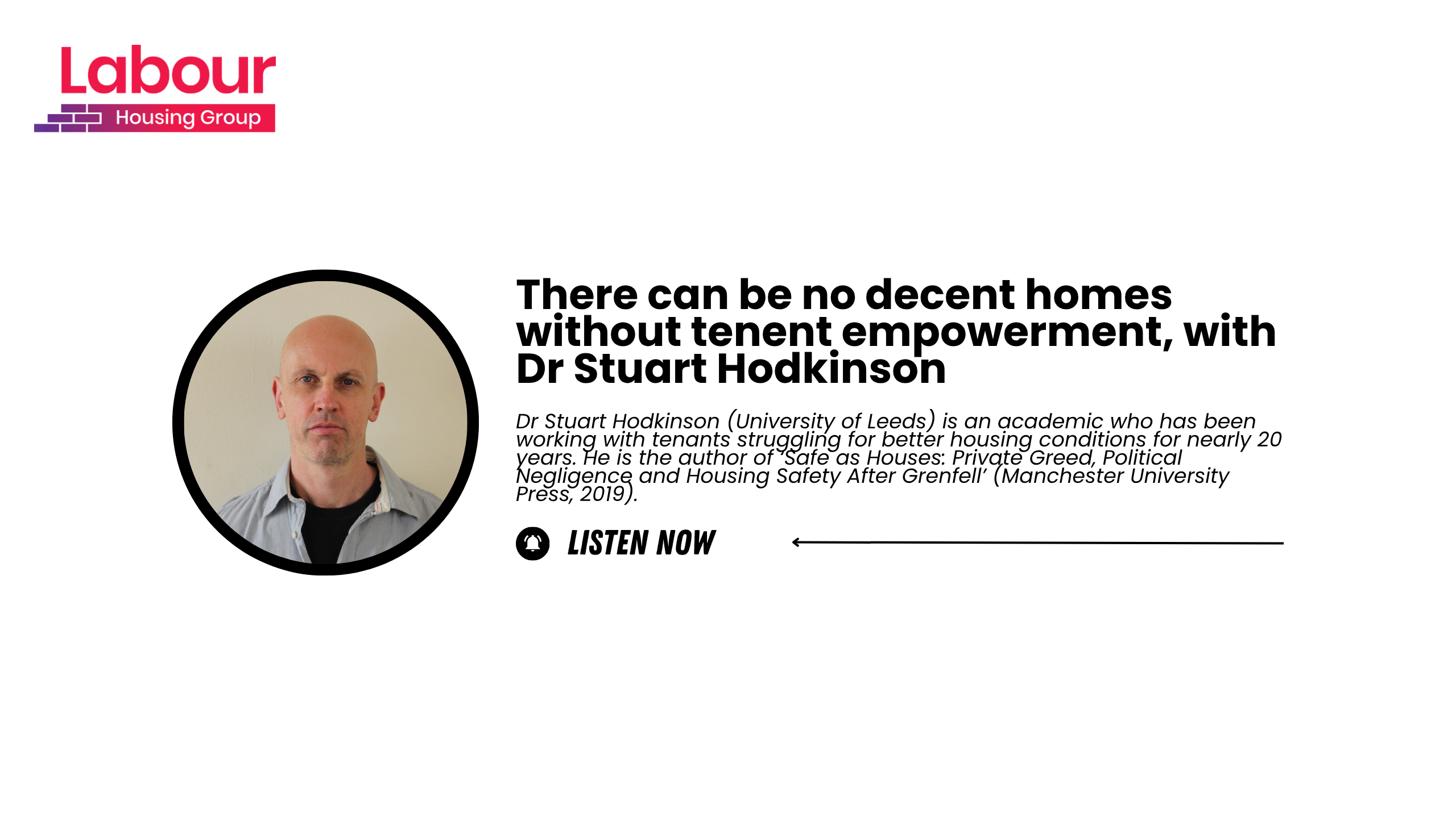 Dr Stuart Hodkinson (University of Leeds) is an academic who has been working with tenants struggling for better housing conditions for nearly 20 years. He is the author of ‘Safe as Houses: Private Greed, Political Negligence and Housing Safety After Grenfell’ (Manchester University Press, 2019). He has recently been involved in the Manchester Social Housing Commission, which has put forward proposals for increasing the delivery of sustainable homes for social rent.